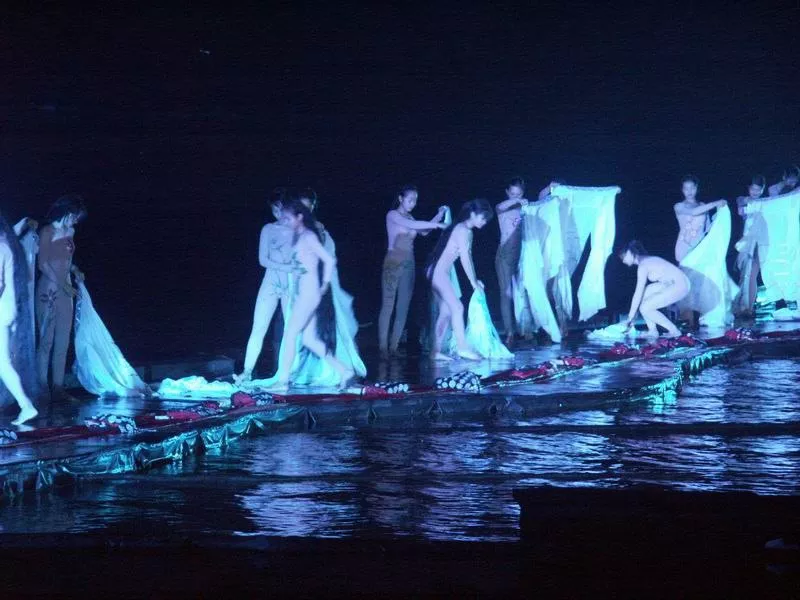 2003年,由内地导演张艺谋策划的实景剧《印象刘三姐》在桂林阳朔如期上演。然而,首演时的情形却颇为出人意料。此剧的尺度颇大,当时担任主演的女演员王予嘉竟然全果出场。