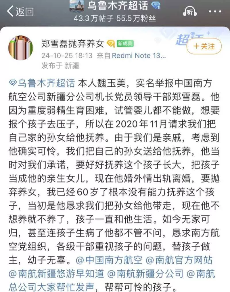 南方航空新疆分公司的机长郑雪磊近期遭到前妻实名举报,指控其在婚姻期间出轨。更令人感到心痛的是,他因无法生育而特意收养的女儿也因此受到影响,被一同抛弃。