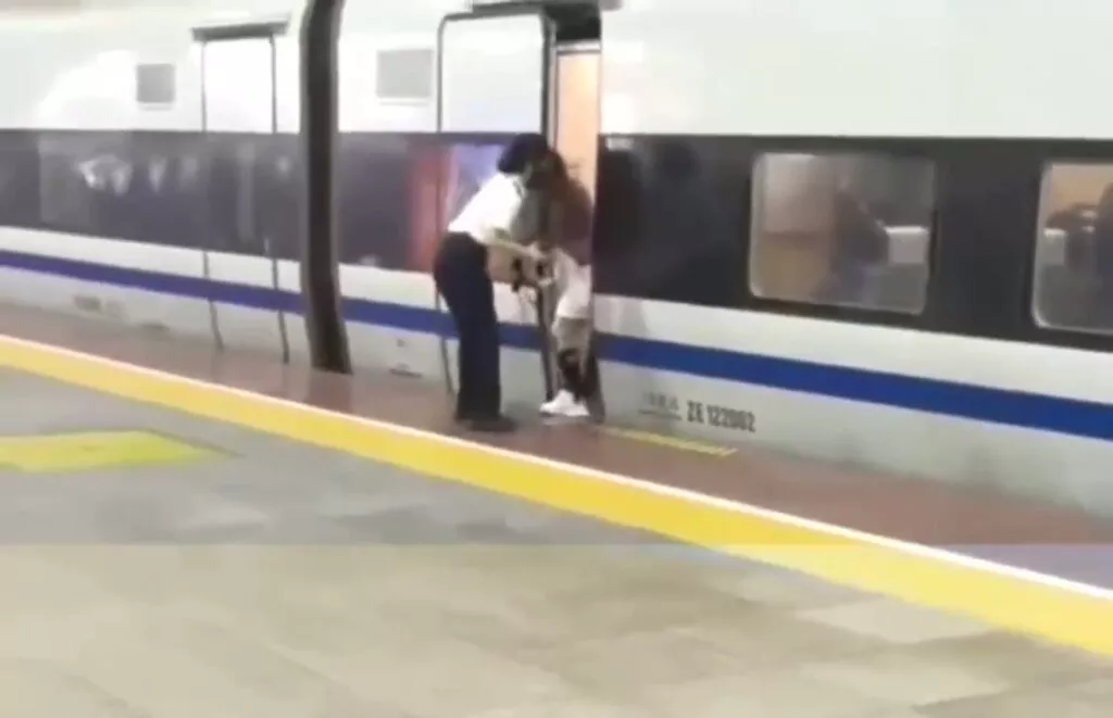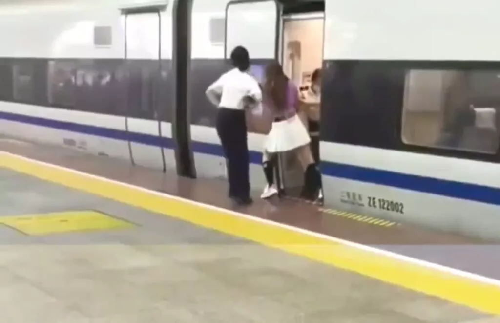 D2404在深圳北站的3号站台停靠,以便旅客上下车。在完成上下客工作后,车门开始关闭。这时,一名女性乘客试图用身体阻挡车门,以等待同行的朋友上车。尽管站台工作人员竭力劝阻,但未能阻止她的行为。