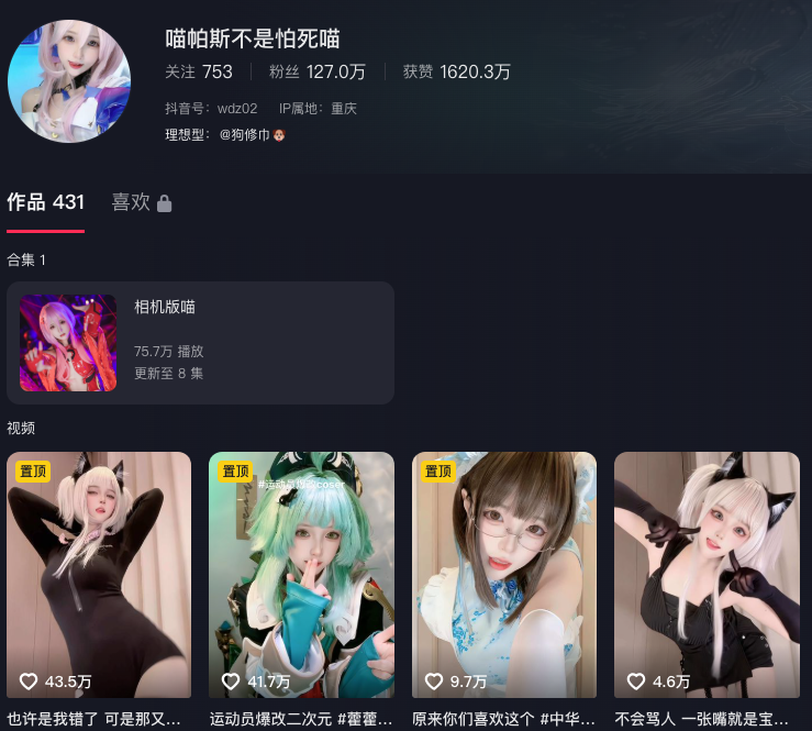 抖音上拥有127万粉丝的擦边网红coser喵帕斯以其独特魅力征服了众多观众。她不仅展现了白皙、纤瘦的青春美感,更是萌系LL风格的顶尖代表,成功吸引了无数老司机的目光。随着粉丝的持续增长,她还推出了线下收费定制福利视频——《幽灵娘》。在这个节目中,性感的白丝幽灵娘将对你展开热情的追逐,务必小心,别被她深深吸引而无法自拔。