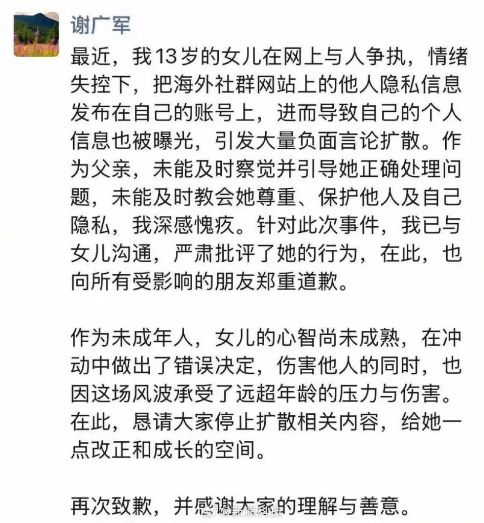 现在的饭圈文化已经变的越来越魔楞,百度副总裁谢广军13岁的女儿在微博与一位网友起了争执,结果就这样把这位网友的个人信息全部开盒公布到微博,而起因竟然是在讨论张元英的24小时行程。