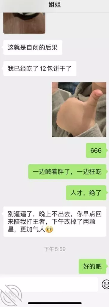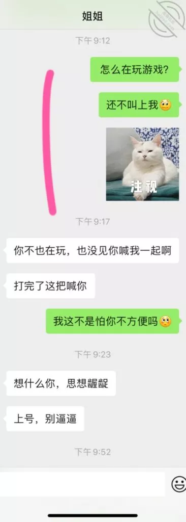 晚上无聊打游戏,一局完毕后看到姐姐也在游戏中,赶紧发了个消息问候了一下,后面聊了会天,发现姐姐没有和大哥在一起过夜,但看他的朋友圈动态明显的是在陪大哥玩耍。