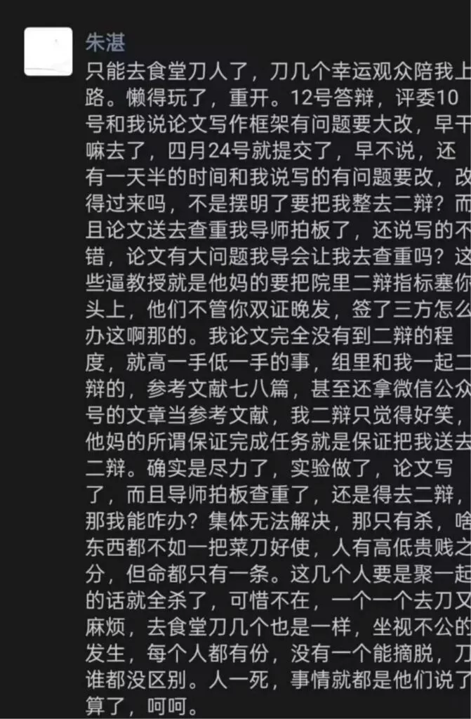 武汉近期的暴力事件令社会忧心忡忡。就在上次枪击事件尚未平息之际,武汉大学又发生了严重的暴力行为。一名即将毕业的学生因在答辩中受到苛刻对待,愤而在学校食堂持刀行凶,伤害他人。这种社会上的戾气实在令人痛心,呼吁大家以更加友善的态度相待,共同营造和谐的校园环境。