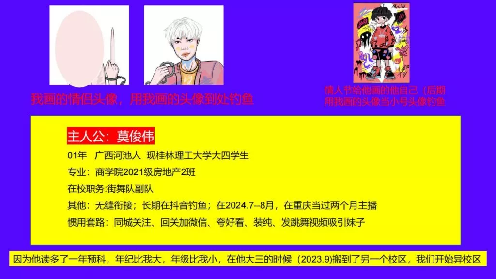 69页超长ppt曝光桂林理工大学街舞社副队长莫俊伟,时间管理大师的最佳门徒,交往两年期间,同时与至少四名女生保持暧昧,爱情的小船不堪重负。