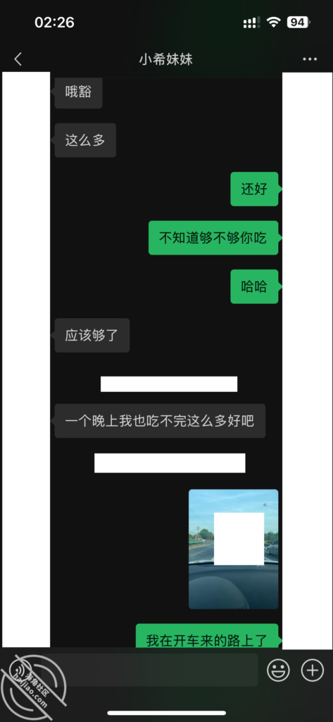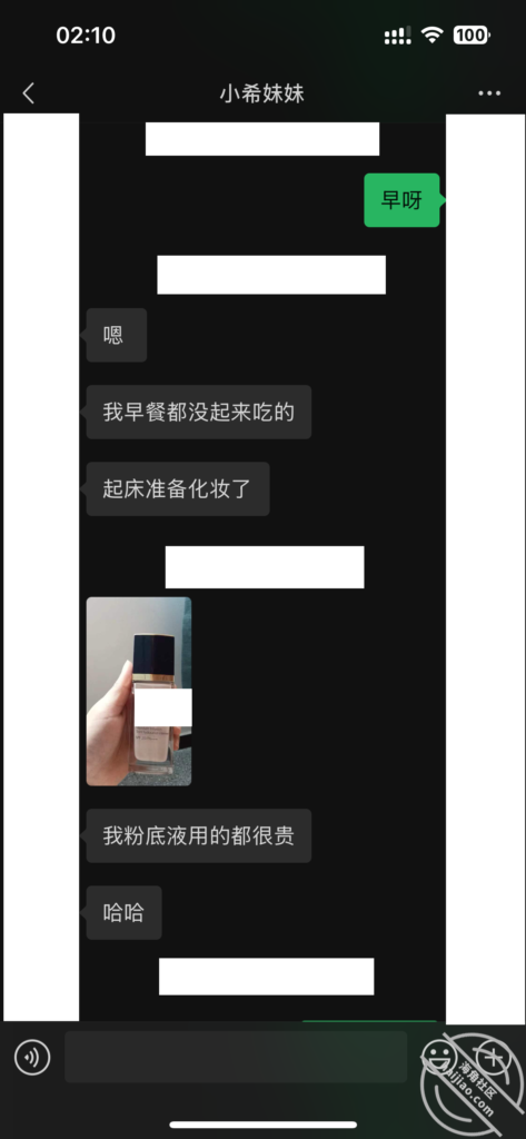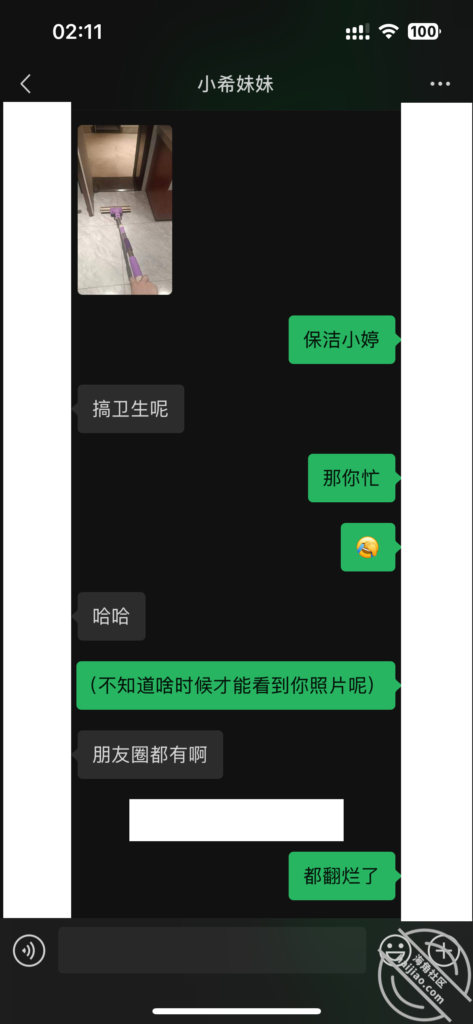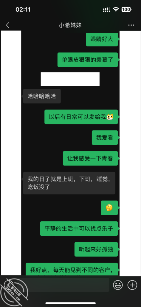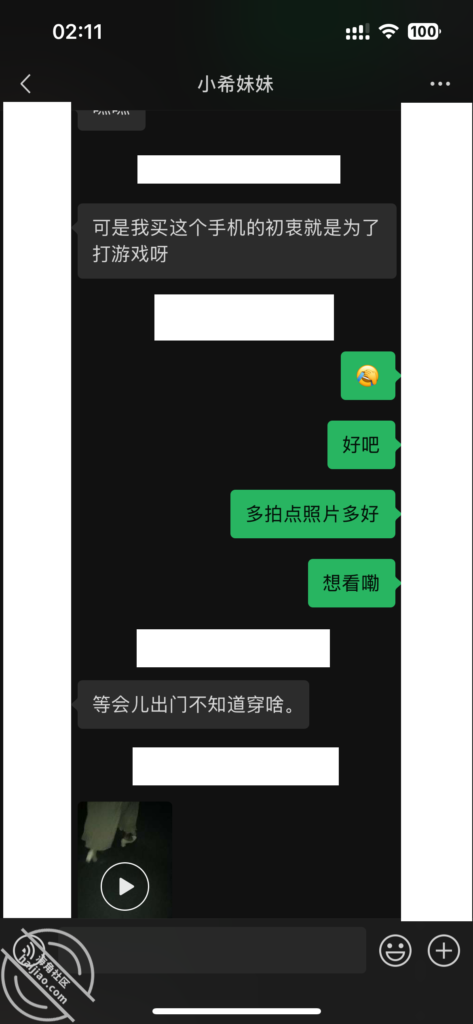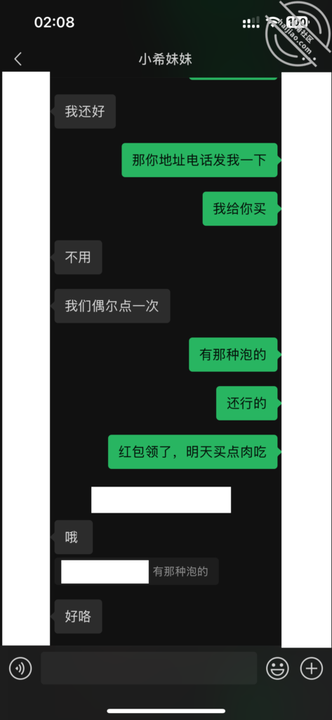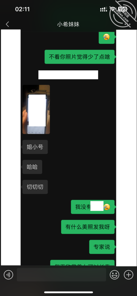 当我每天不断的找她聊天,在她心理已经对我产生了好奇和好感。我所做的就是不断的加深,通过平常的小礼物,和红包,在她心中不断的埋下一个种子。其实她也是有一点小心机的,这里给我发照片的时候,特意把自己的腿拍了进去。