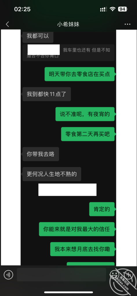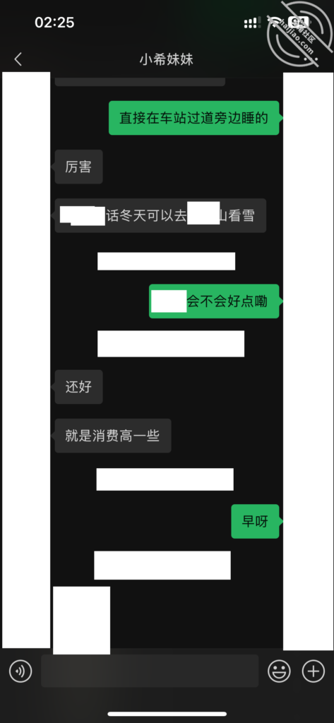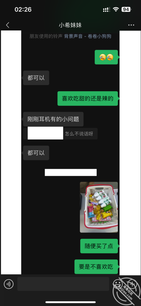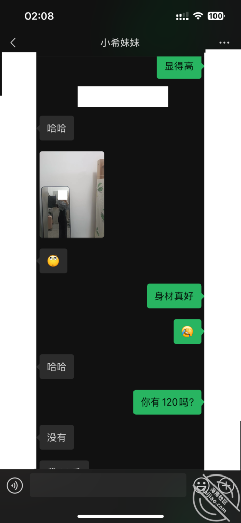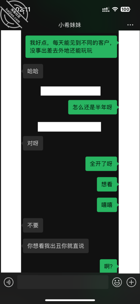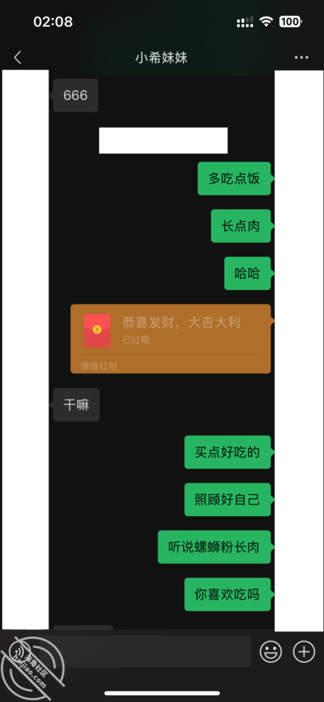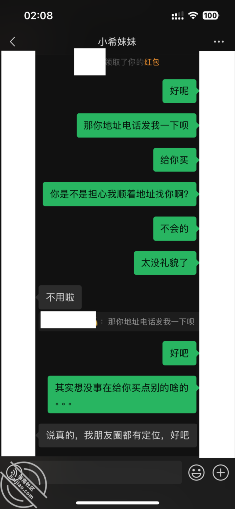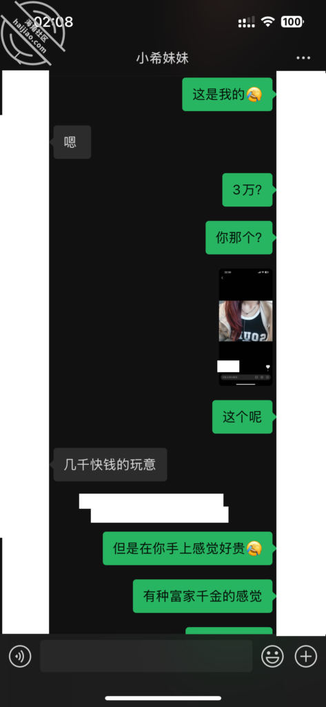 当我每天不断的找她聊天,在她心理已经对我产生了好奇和好感。我所做的就是不断的加深,通过平常的小礼物,和红包,在她心中不断的埋下一个种子。其实她也是有一点小心机的,这里给我发照片的时候,特意把自己的腿拍了进去。