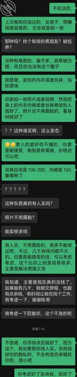女大学生其实比较相信我,我说这些衣服和照片我都会拿去卖钱,然后卖出去了就转给她,所以她会自己拿到衣服就拍各种照片给我,原味生意这个借口不能放,不然兄弟我就翻车了。所以只能加大投入了。不过优点是兄弟们有眼福了,不瞎BB,上你们最想看的东西啦。最后一张是极品,大爱,可以做屏保了。