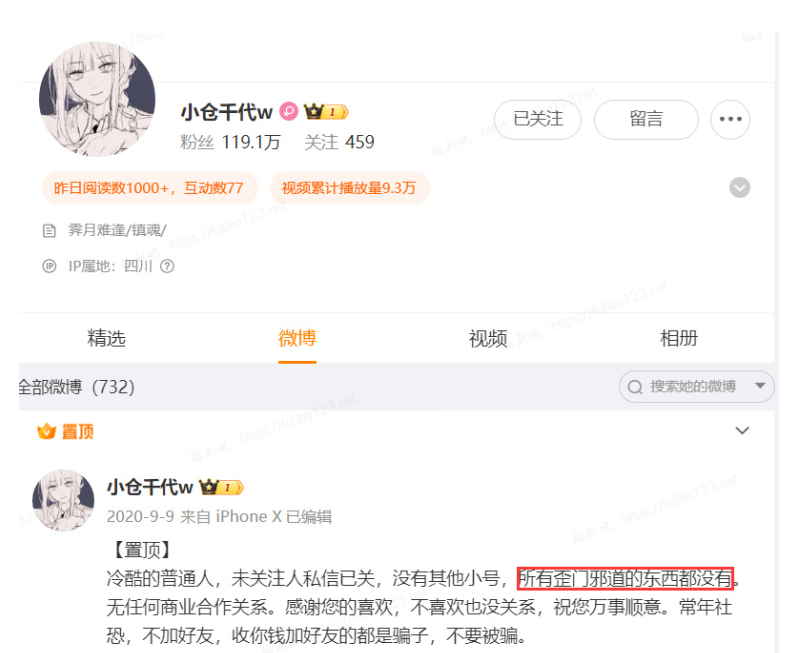 这位up主还在微博置顶信息里,坦言自己没有小号,也从不接触任何歪门邪道的东西,没想到啊,实际上浑身上下全都被看光光了