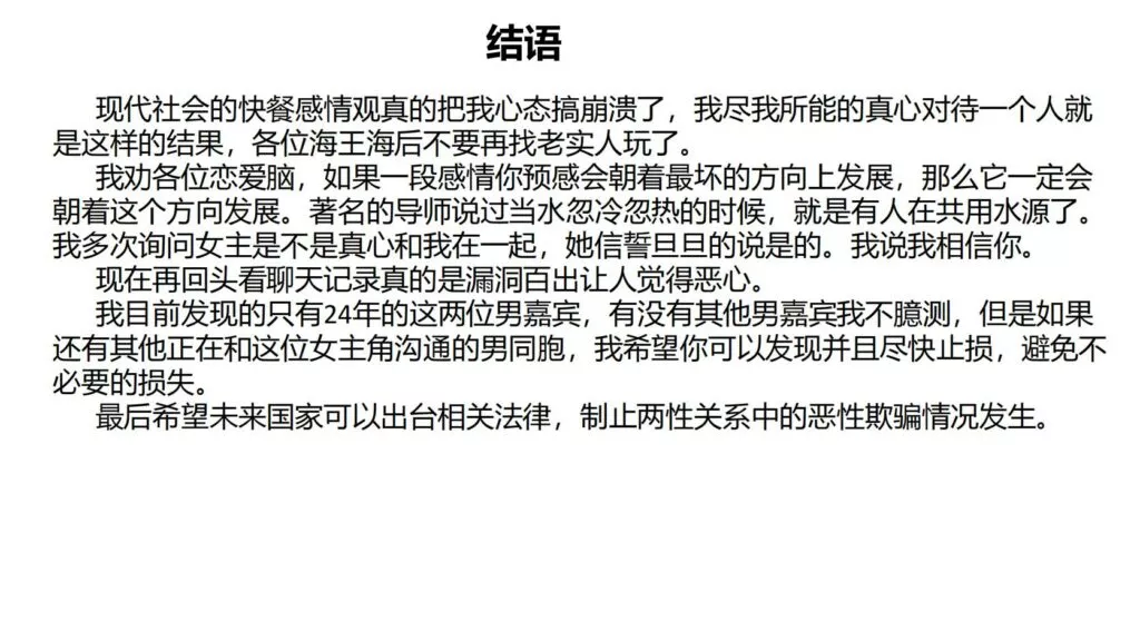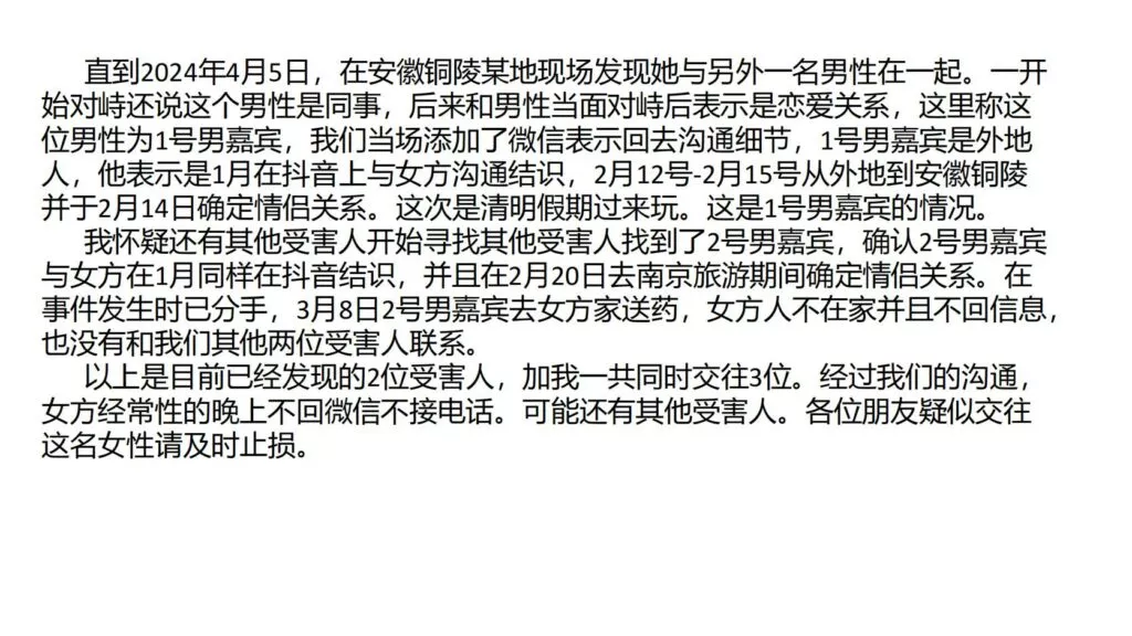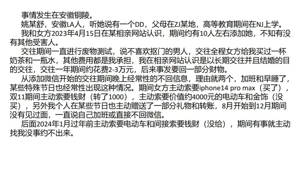 25页PPT揭示安徽铜陵女海王姚某舒同时与三男友交往,用一瓶水或扔茶便能让男友购买价值上万的IPhone14promax,表明她的绝佳交际能力和高超手段。她每天都会寻找各种理由索要钱财和礼物,贪婪无底线,且手段越来越高明。当男友约会时,她常以加班或不回信息为由拒绝,以维持与三男友的微妙平衡。
