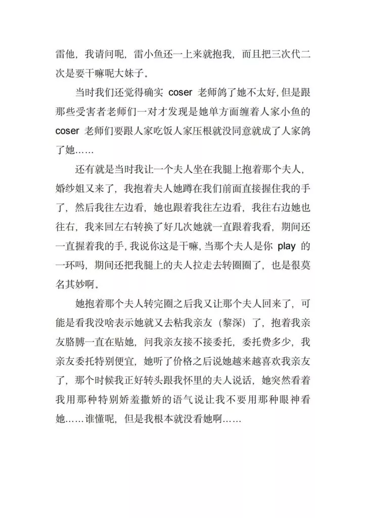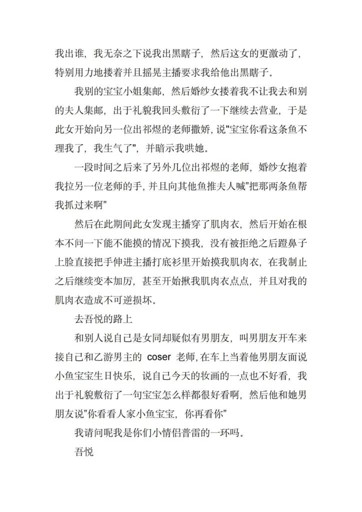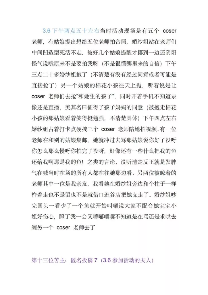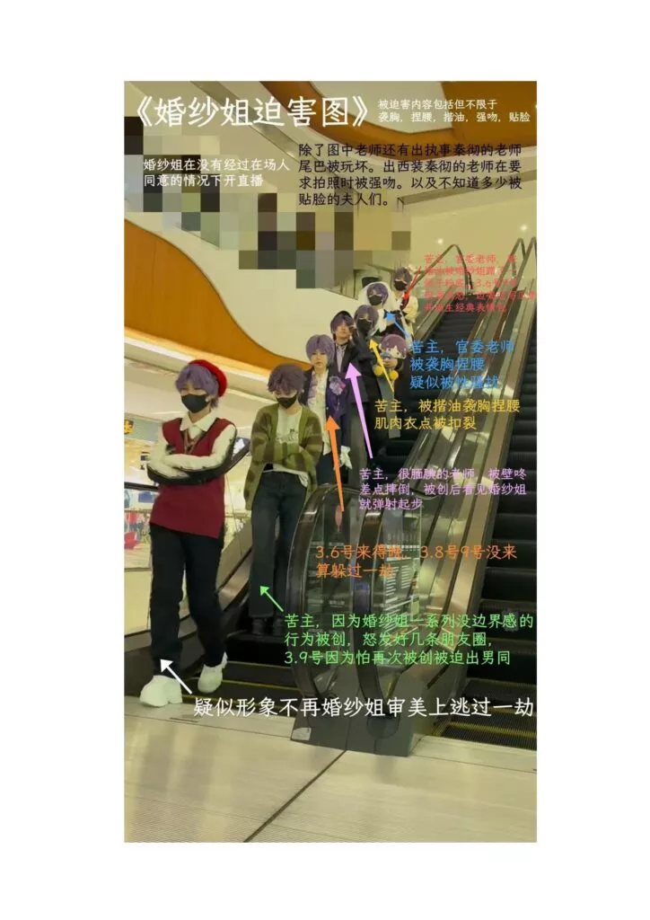 coaplay圈传来抽象大瓜,漫展本来是动漫爱好者和coser的盛典活动,一众爱好者的热闹派对,没想到却成了一些抽象人士的作案现场,一位穿着恋与深空国乙婚纱cos服装的女士成为了这场漫展所有参与者的噩梦。